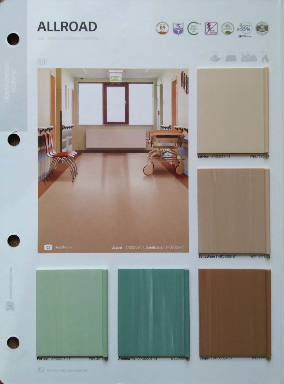 LG Hausys Medistep Allroad merupakan material lantai vinyl roll dengan katahanan yang cukup super. Terbuat dari dasar bahan PVC (polyvinyl chloride) dengan ketebalan 2mm.